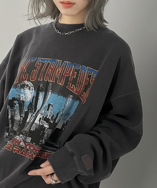 ヴィンテージ風のグラフィック(UFO・摩天楼・ギャラクシー)がピグメントとマッチしており、