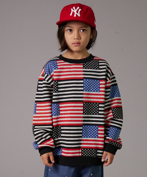 インパクトバッチリな総柄デザインの裏起毛スウェットが登場です。襟と袖口は配色リブになっており、コーディネートを引き締めて大人っぽい着こなしに仕上がります。