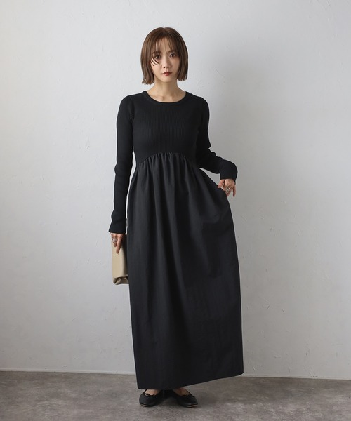 トップスはリブニット、ボトムスはワッシャーナイロン素材の切り替えが印象的なコンビワンピース。