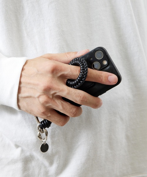 レザーコードを輪のパーツに編み込んだフィンガーストラップ。