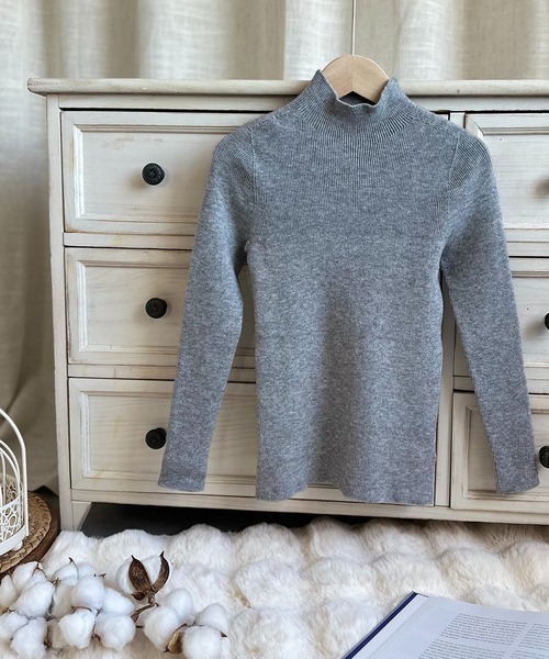 シンプルなハイネックニットトップス。