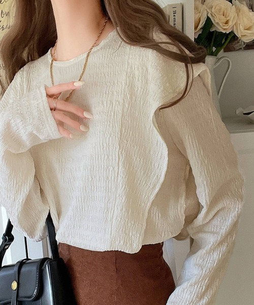 肩にラッフルフリルをあしらった、エレガントなトップス。