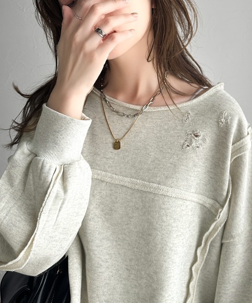 ダメージ加工と切りっぱなしデザインがイマドキな裏毛プルオーバー。