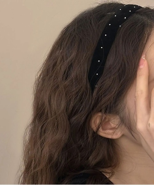 小さなラインストーンを配置した、ベロア素材のカチューシャです。
