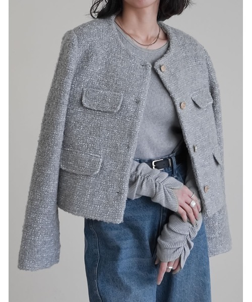 ループ×リボンテープで風合いを表現した魅力的なボアリボンツイード風ジャケット。