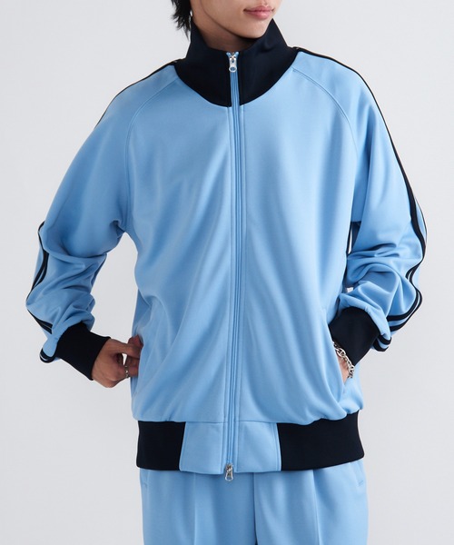 ラグラン仕様で動きやすく裾リブでおしゃれに仕上げたトラックジャケットと、細すぎず太すぎない程良いサイジングのトラックパンツのセットアップ。