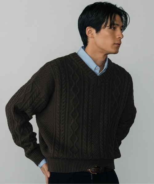 立体感のあるケーブルの編地で生地に表情が生まれ、1枚でも様になるケーブルニット。