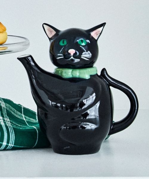 ヴィンテージ食器を思わせるようなたたずまいの立体的なネコのシルエットのティーポット。