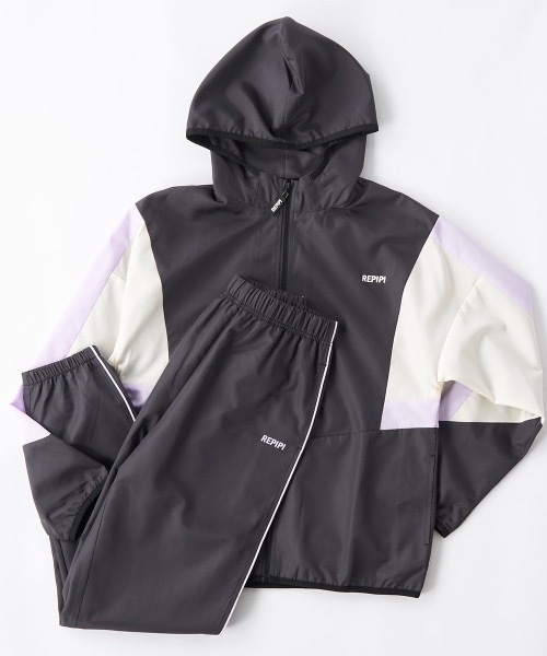 薄くて軽いポリエステル素材のパーカーとパンツのセットアイテムは裏メッシュ仕様なので汗をかいてもベタ付きにくくスポーツにもおすすめ。1年を通して着やすいアテムです。