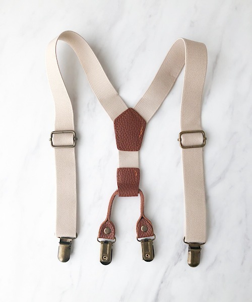 バックスタイルに位置するブラウンのフェイクレザーが印象的なキッズサスペンダー。