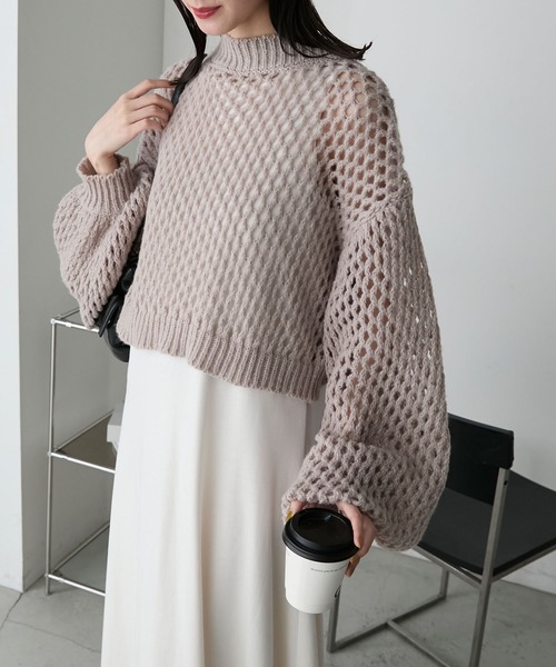 ざっくりとしたメッシュ編みで仕上げたニットは、ふんわりとしたボリュームスリーブと着丈の短いクロップド丈で好バランスな1着に。