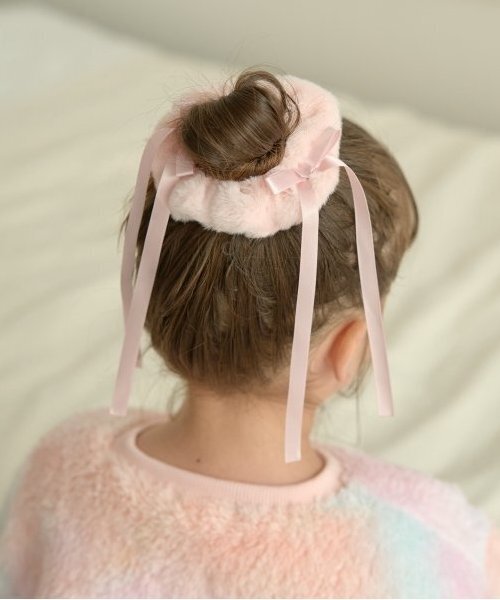 バレエコアコーデに欠かせない繊細なリボンがついたフェイクファーシュシュです。