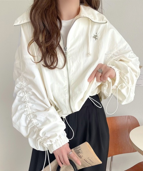 ブルゾンのギャザースリーブが肩のラインを美しく見せ、全体に女らしさをプラス♪