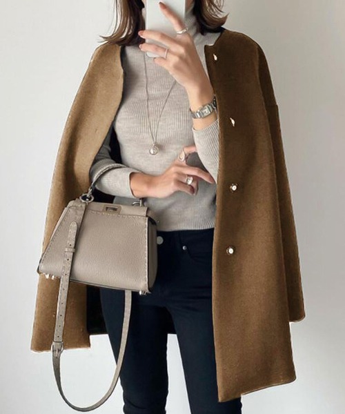 さらっと羽織れる♪ミディ丈ノーカラーネオウールコート