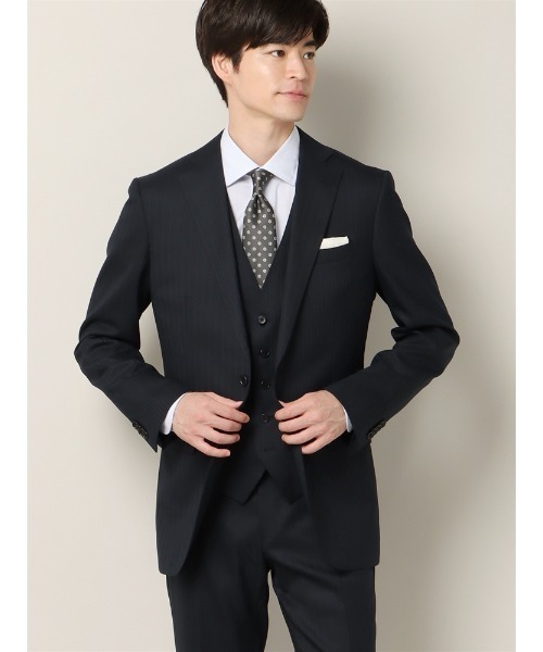 2種のストライプを交互に配したどこかクラシカルな雰囲気を醸し出すストライプ柄スーツ。ジレを重ねれば、会議やプレゼンなどで貫禄を纏いたい日も重宝します◎ 機能性も抜群で、一着は持っておきたいスーツです!