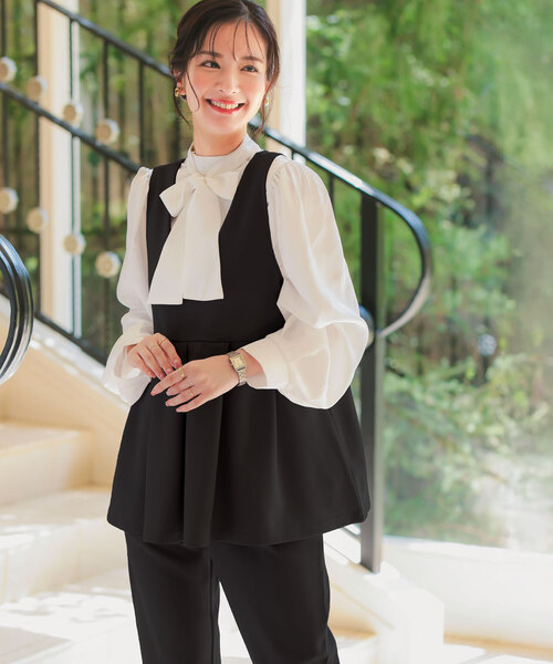 ベストはVネックと丸首の前後2way、ブラウスはリボンを前後どちらでも結んでいただけるので、組み合わせ次第で様々なスタイリングが可能です。