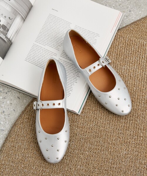 ●バレエシューズにスタッズを施し、存在感のあるデザインに仕上げた一足