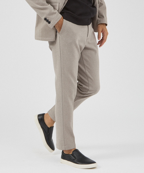 秋冬らしい程よい厚さの起毛感が特徴のウールライクポリエステル素材を使用。 主張しすぎないへリンボーン柄を施すことで、秋冬らしいシックな雰囲気に仕上げました。 ストレッチ性も兼ね揃えているので快適に着用いただけます。