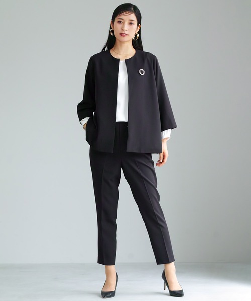 ダブルピケクロス・ノーカラーフレアージャケット&美脚テーパードパンツ&パール調ブローチ
