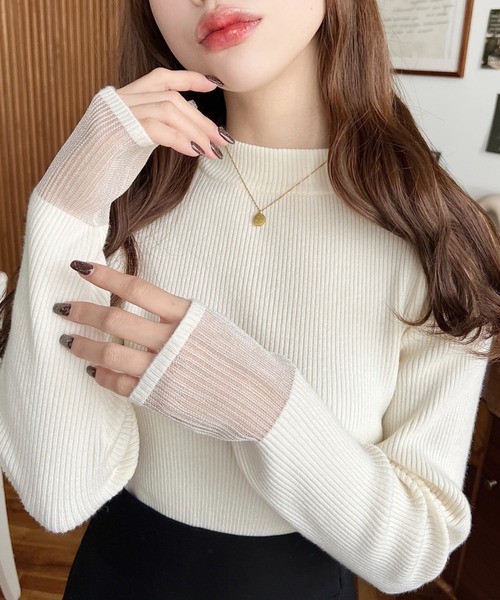 ・シンプルリブニットで袖だけシアーになったお洒落ニットが仲間入り!異素材ミックスがさりげなくて◎