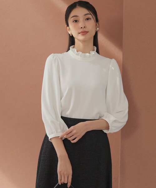 柔らかなとろみ素材でエレガントに映える、スタンドフリル襟ブラウス