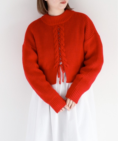 編み上げを前に着用すると可愛らしい印象に。リボン結びでもそのまま垂らしてもOK。
