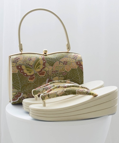 【utatane 草履バッグセット 西陣帯地 3枚芯 若草蝶々×クリーム】