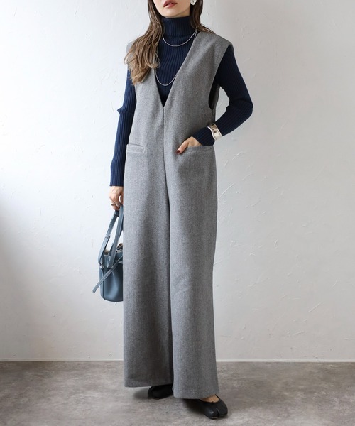 シャープな印象を与えるディープVネックデザインが特徴のオールインワン。