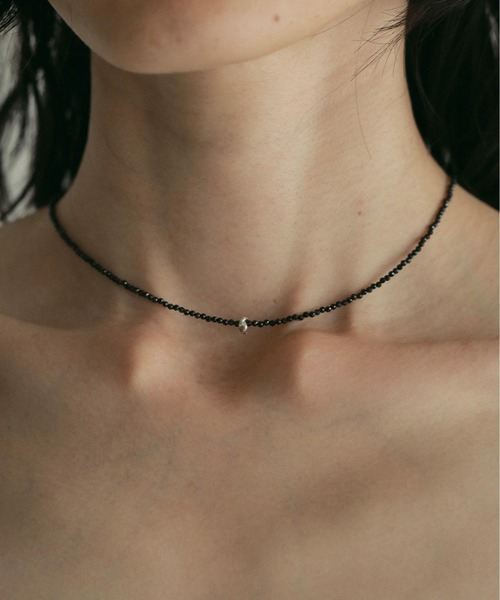 小粒のカラーストーンとメタルパーツを組み合わせたショートネックレス。