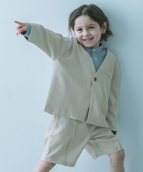 こなれ感のある『フォーマル ノーカラージャケット セットアップ(ハーフパンツ)』こなれ感と遊び心のあるハーフパンツのセットアップ。