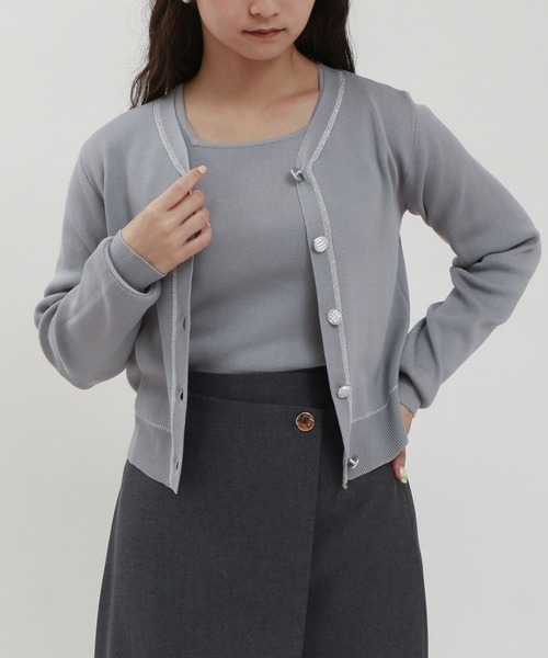 ラメ糸のライン配色がポイントのアンサンブルニット。