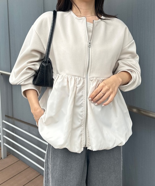柔らかく、立体的なフォルムが叶うダンボール素材が魅力♪素材切替とフォルム感がポイントのペプラムブルゾン