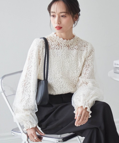 袖にフラワーレース×チュールを配したドッキングデザイン。
