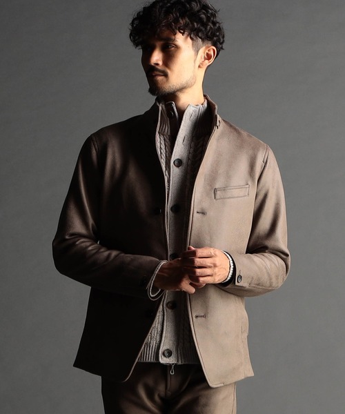 スタンド、イタリアンカラーのカヴァーオールデザインジャケット。衿端にはワイヤーを入れ、その衿部分は折り返してラペルとしても綺麗に収まる設定です。衿タブで上まで止める事が出来るので防風性もあり、ストレッチ裏地を採用した総裏仕様なので着心地も抜群です。左胸ポケットはフェイクチーフ仕様、袖口は本切羽、腰ポケットは斜めに作り使いやすくしています。(一番下の釦は止める設定になっていませんのでご注意ください。)
