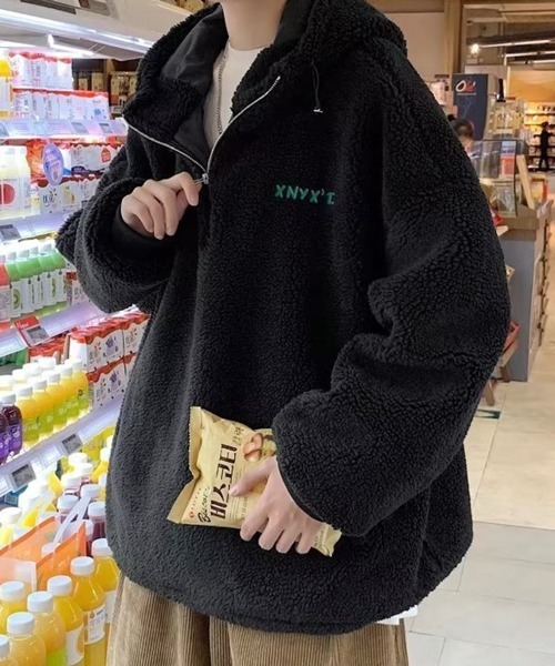 ボアブルゾン ハーフジップ フーディー プルオーバー ボアジャケット もこもこ ルーズシルエット ビッグシルエット オーバーサイズ ユニセックス ペア お揃い ストリート カジュアル 防寒 アウター 刺繍 秋冬 韓国ファッション