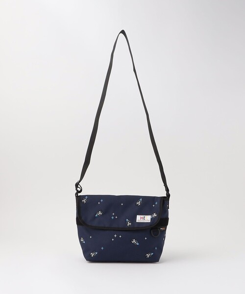 ネイビーをベースに、ユニバース刺しゅうを施したメッセンジャーバッグ。