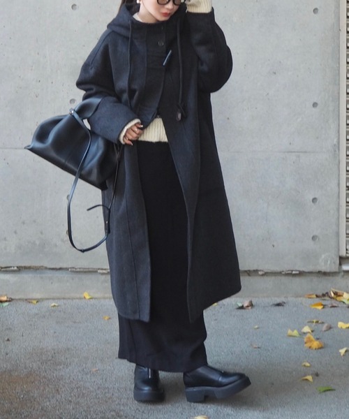 首元はあたたかなスタンドカラー×フードで、ややカジュアルな表情もプラス。
