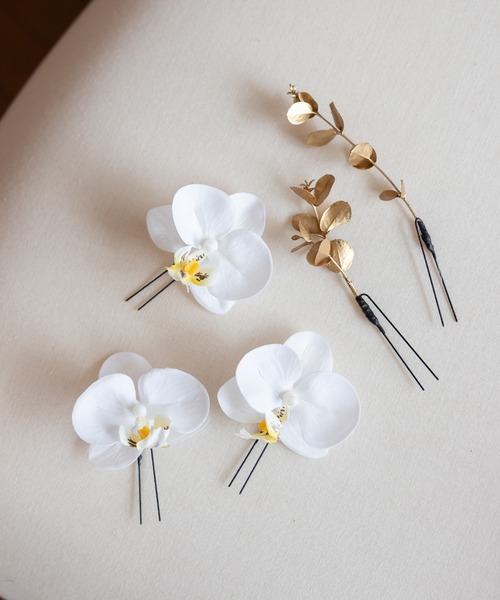 胡蝶蘭とゴールドのヘアアクセサリーのセット。