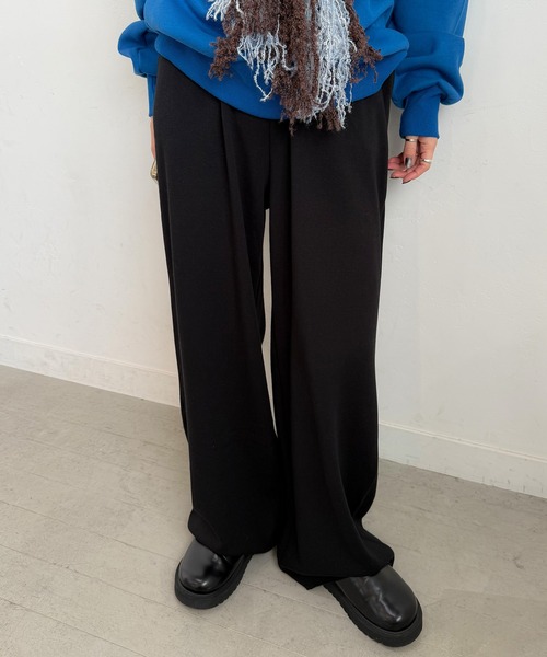 ゆるっとしたワイドシルエットを活かして、スウェットやニットと