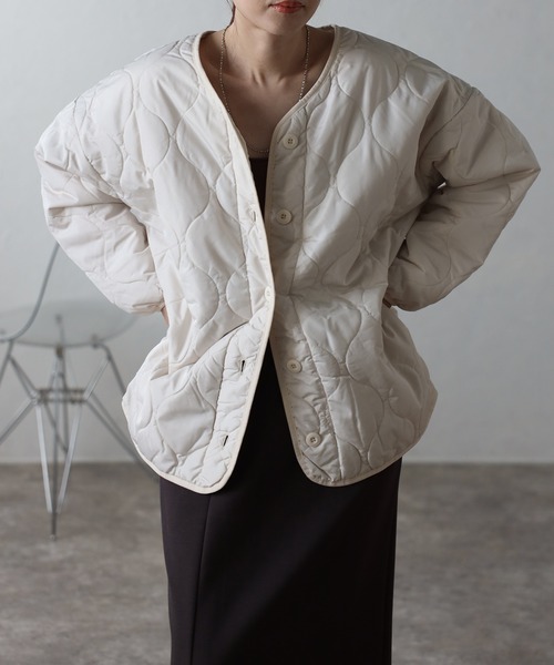 ◆あったかキルトがカジュアルかわいい◆ほどよくゆるっとしたサイズ感がかわいいキルトブルゾン。使い勝手の良いミドル丈とノーカラーデザインが、冬のデイリーコーデに活躍間違いなしです。表面はトレンド感のあるウェーブキルト素材。中綿入りでしっかりと防寒してくれます。