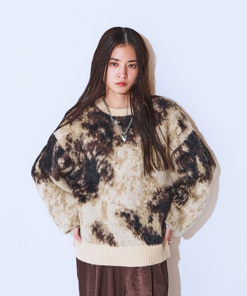 ふっくらとした微起毛ベースの糸と、なめらかなシャギー糸を組み合わせて編み上げているので、柄ニットながら柔らかい雰囲気が特徴のアイテムです。