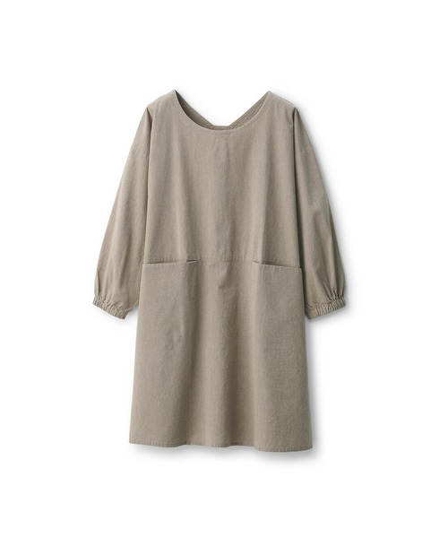 襟ぐりが広いので、かぶって着脱しやすい割烹着です。袖口のゴムを_取り替えられるホール付き。