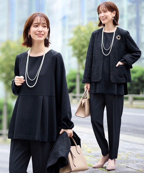 ・ツイードジャケット・ペプラムトップス・テーパードパンツと着回しの利く3点セット。
