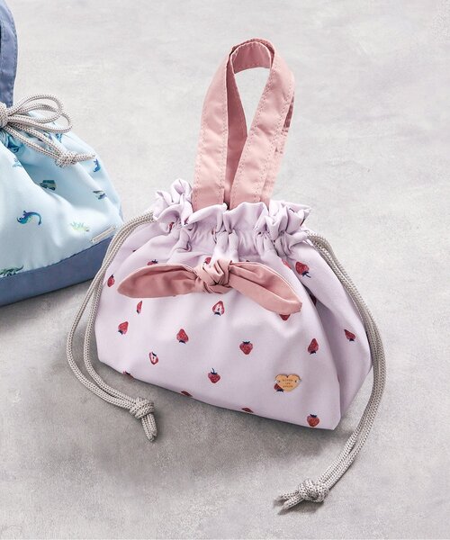 apres les cours(アプレレクール)の「いちご・恐竜柄ランチ巾着」は、ナチュラルなスタイルにさりげなくデザインをプラス♪