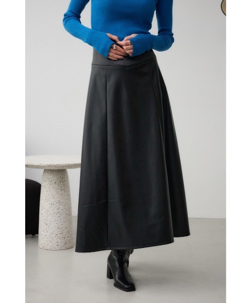ストレッチの効いた合成皮革素材を使用したフレアシルエットのロングスカート。
