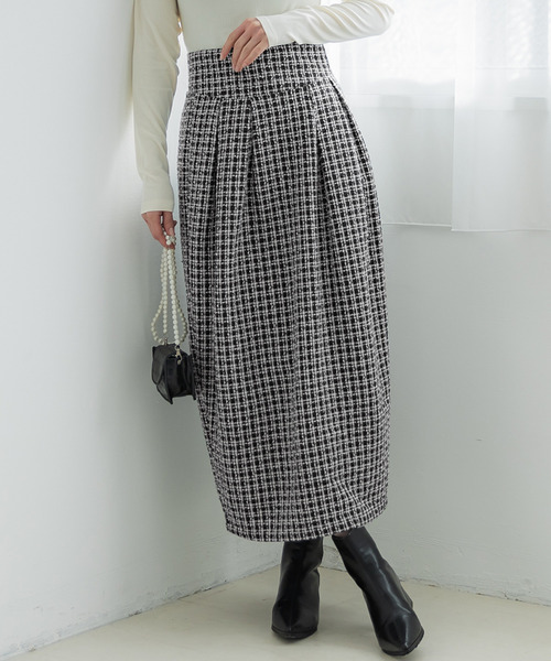 ツイード素材を使用したコクーンシルエットのロング丈スカート。