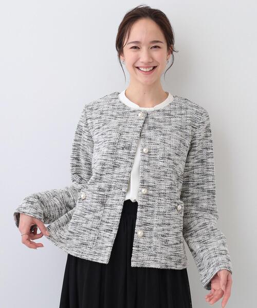 優雅な印象を演出するカットツイードノーカラージャケット。