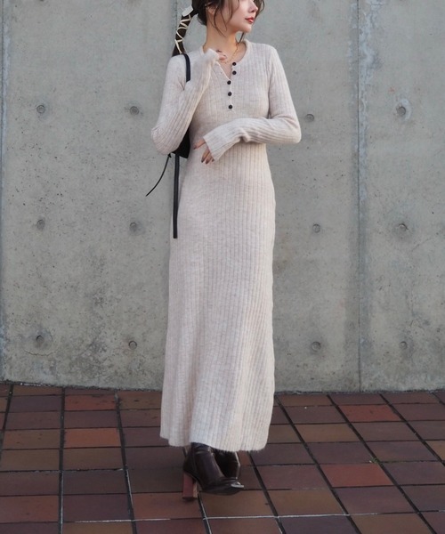 ヘンリーネックがポイントのスタイルアップを叶えるロング丈のリブニットワンピース。