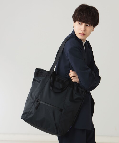 サイドのピスネームがデザインポイント軽量で耐久性に優れたリサイクルリップストップ素材が採用されたトートバッグ。手持ち、肩掛けの両方に対応するダブルハンドル、14インチまでのノートパソコンに対応するサスペンド式スリーブ、AirTag(R)用隠しポケットなどを備え、シンプルデザインながら機能性に優れています。デイリーに活躍する広々とした容量に開閉がスムーズな取り出し口のジッパー、シーンを選ばないタイムレスなひと品です。