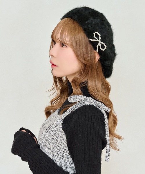 フェイクパールのリボンがポイントのベレー帽。